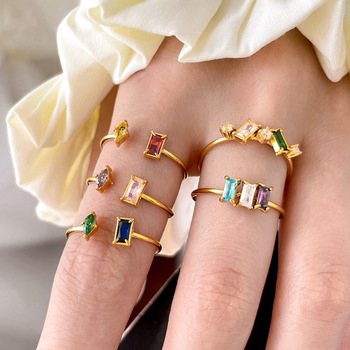High End Women's Stainless Steel Rings 18K Gold Plated Geometric Colorful Zircon Open Rings