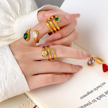 แหวนเหล็กสแตนเลสสำหรับผู้หญิงปลายสูง18K แหวนเพทายสีสันสดใสทรงเรขาคณิต